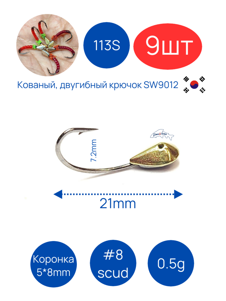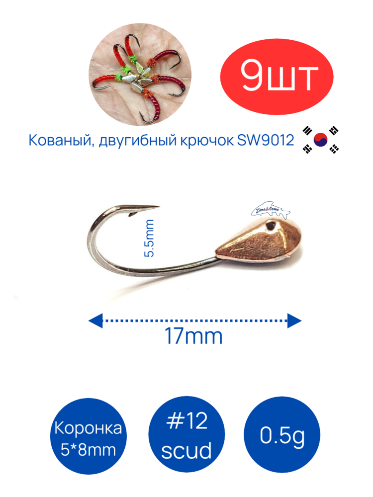 - Кованный, двугибный крючок формы scud, Ю.Корея #12, 10, 8, 6